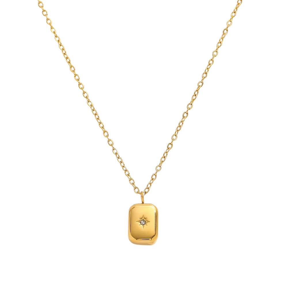 The Solace Necklace features a polished rectangular pendant etched with a delicate celestial star, finished with a subtle crystal detail that softly catches the light. Minimal yet meaningful, it’s a timeless piece made to be worn close, a gentle reminder of peace, protection, and inner glow.